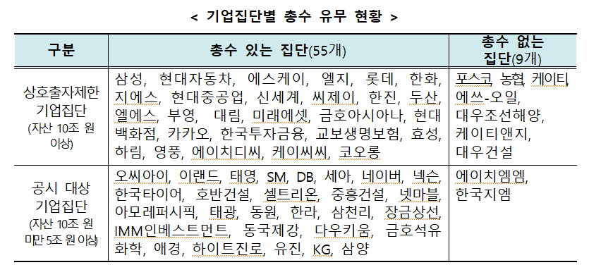 총 64개 기업 집단 중 총수(오너)가 있는 기업집단이 55개, 총수 없는 집단이 9개로 나타났다.