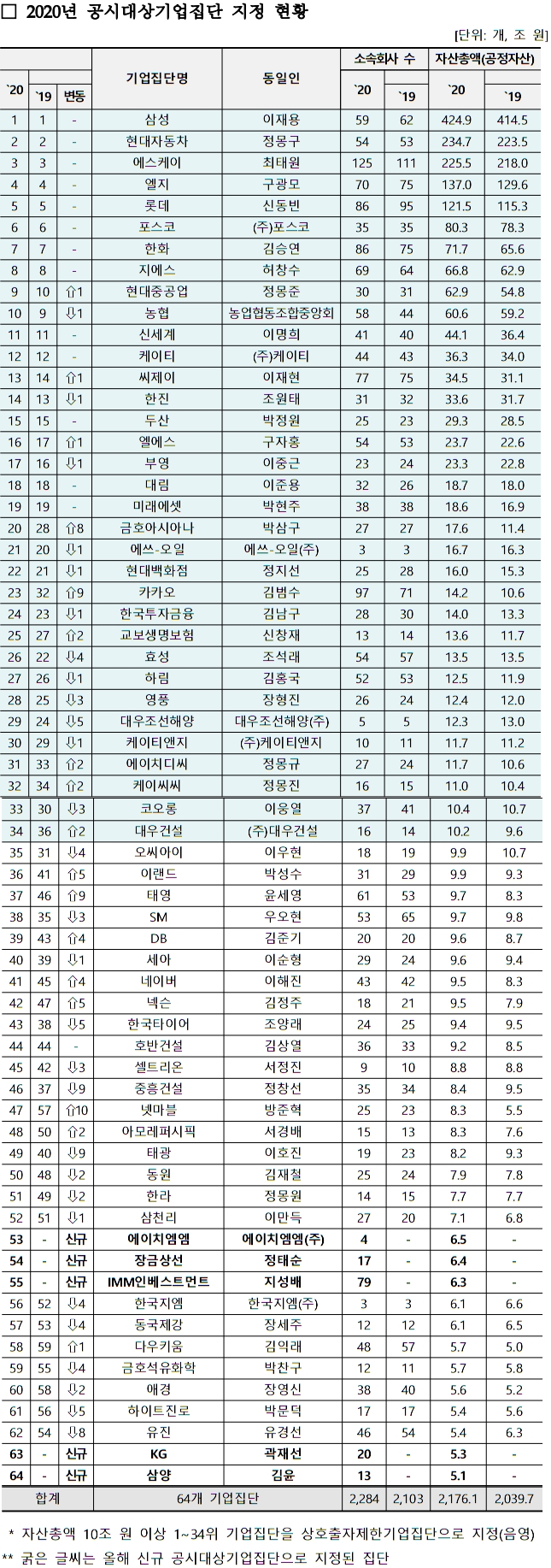 2020년, 올해는 자산 5조 원 이상의 64개의 기업집단이 지정되었고, 이중 34개는